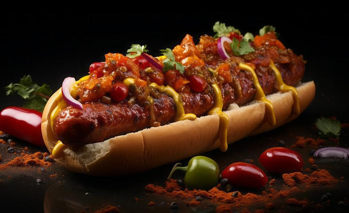 Saucisse, sauce cheddar, bacon, oignons frits, moutarde, ketchup
